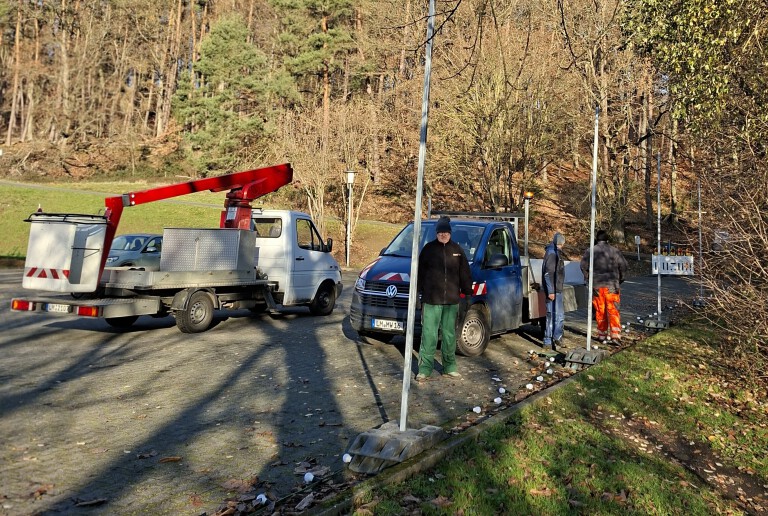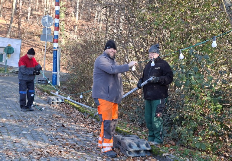 Ein Teil der Freiwilligen fuhr nach kurzer Besprechung in den Wald, um Äste zum Schmücken der Buden zu holen und der Rest half den Bauhof Mitarbeitern beim Aufhängen der Lichterketten, machte Besorgungen und räumten Dinge auf. So konnte alles wunderbar vorbereitet werden, wenn am Freitag die Vereine kommen und die Buden aufbauen.