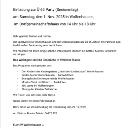 Einladung zur Ü 65 Party am Samstag den 1. November in Wolfenhausen im Dorfgemeinschaftshaus von 14 Uhr bis ca. 18 Uhr. Fahrservice kann...